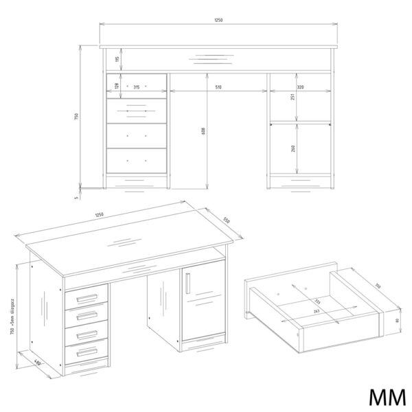 Wyposażone w 4 szuflady oraz zamykany 1 drzwiami schowek z 2 półkami, zapewnia dużo miejsca do przechowywania dokumentów, książek czy akcesoriów biurowych. Dodatkowa otwarta półka pod blatem idealnie sprawdzi się na drobne przedmioty, laptopa czy zeszyty.