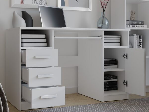 Wyposażone w 3 szuflady oraz zamykany 1 drzwiami schowek z 2 półkami, zapewnia dużo miejsca do przechowywania dokumentów, książek czy akcesoriów biurowych. Dodatkowo, pod blatem do dyspozycji jest wysuwana półka na klawiaturę, co ułatwi korzystanie z komputera.