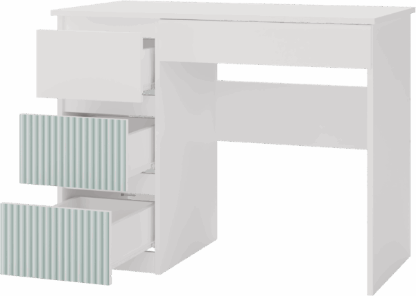 • 3 pojemne wysokie szuflady z lewej strony (w tym 2 szuflady ze wzorami w kolorze miętowym) i 1 niska z prawej strony pod blatem