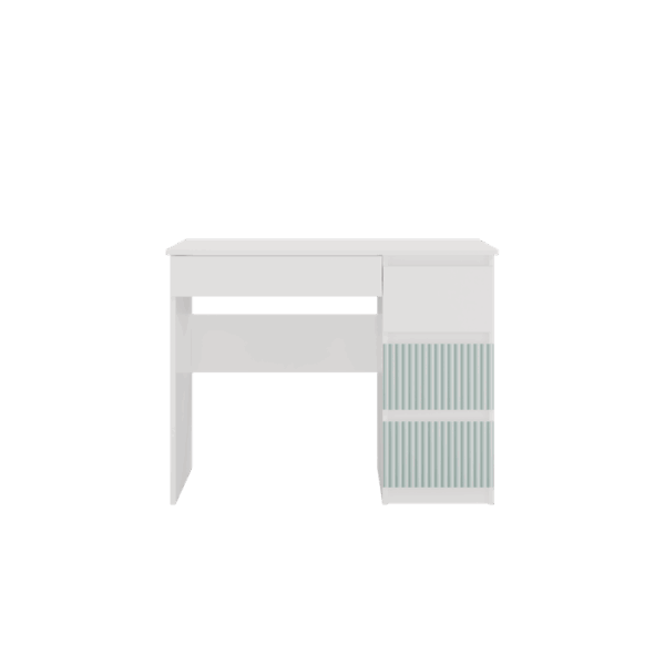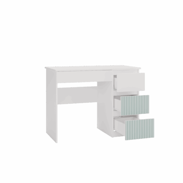 - 3 pojemne wysokie szuflady z prawej strony (w tym 2 szuflady z miętowymi wzorami) i 1 niska z lewej strony pod blatem