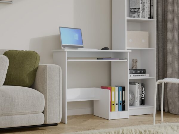 Mebel wyposażony został w praktyczne rozwiązania, które poprawiają komfort pracy: wygodna wysuwana półka na klawiaturę, miejsce na jednostkę centralną komputera lub segregatory oraz dodatkowa dolna półka do przechowywania.