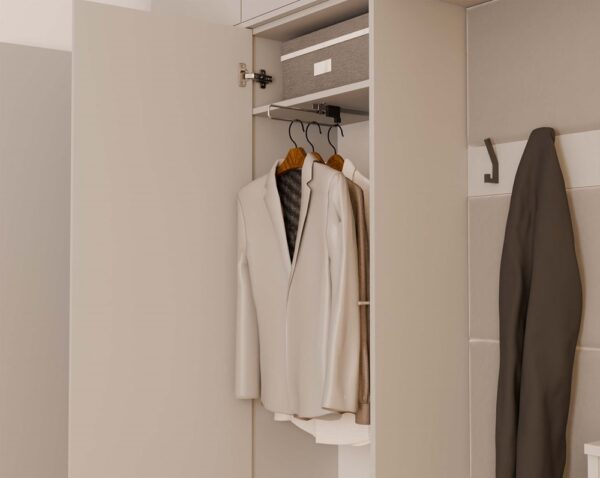 Zamiast klasycznej zabudowanej szafy, model ten wyposażono w otwarty wieszak z haczykami, który pozwala na szybki dostęp do kurtek, toreb czy plecaków. Dzięki temu mebel sprawdzi się zarówno w małych wnętrzach, jak i w przestronnych holach, gdzie liczy się funkcjonalność i optyczna lekkość.