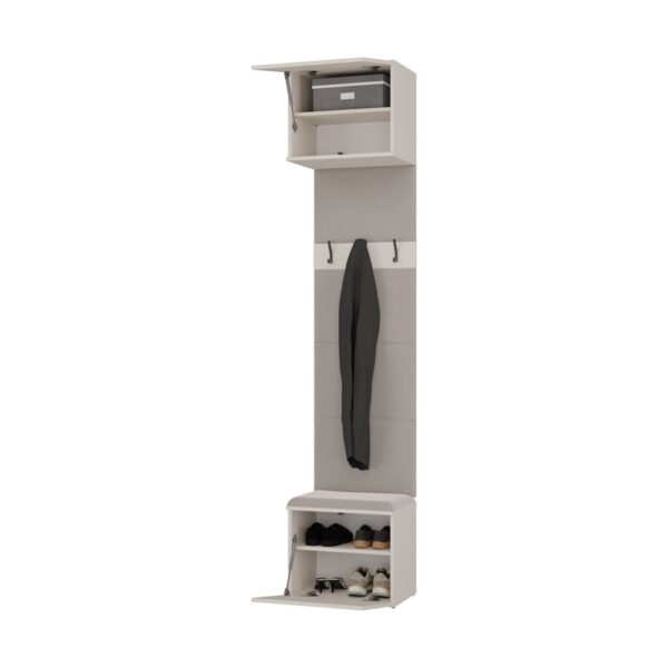 HAGA 1W to kompaktowy i funkcjonalny mebel do przedpokoju, który łączy wygodne siedzisko z miejscem do przechowywania, panel z wieszakami na odzież oraz praktyczną szafkę górną.