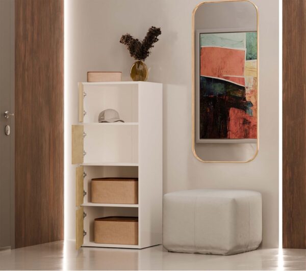 Dzięki pojemnym półkom ukrytym za gładkimi drzwiami, komoda zapewnia mnóstwo miejsca do przechowywania i ułatwia utrzymanie porządku w każdej przestrzeni.