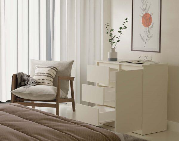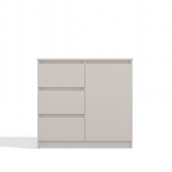 Komoda 1D3S to stylowy i praktyczny mebel, który doskonale sprawdzi się w sypialni, salonie, przedpokoju lub pokoju dziecka. Dzięki przemyślanemu układowi z jednymi drzwiczkami i trzema pojemnymi szufladami, zapewnia wygodne przechowywanie i organizację przestrzeni.