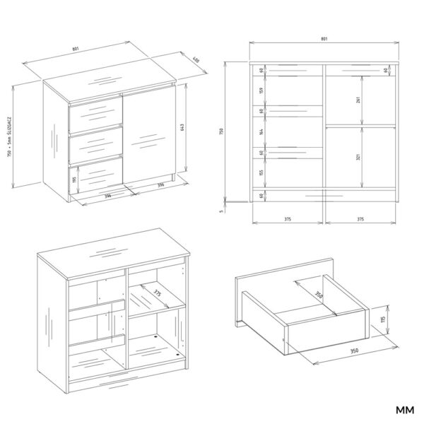 - Funkcjonalne wnętrze – półki oraz 3 pojemne szuflady, które ułatwiają organizację i przechowywanie.