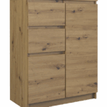 Przemyślany układ jednych drzwiczek oraz pięciu pojemnych szuflad umożliwia wygodne przechowywanie ubrań, dokumentów, akcesoriów czy innych przedmiotów codziennego użytku, pomagając utrzymać porządek w pomieszczeniu.