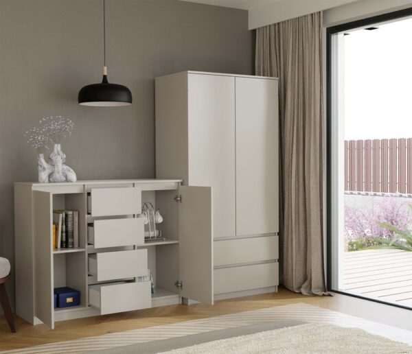 Komoda 2D4S to stylowy i pakowny mebel, który doskonale sprawdzi się w sypialni, salonie, pokoju dziecka lub przedpokoju. Jej uniwersalny wygląd to połączenie prostoty i elegancji, idealne do nowoczesnych i minimalistycznych wnętrz.