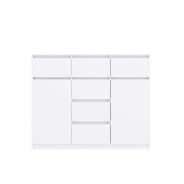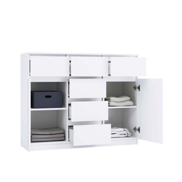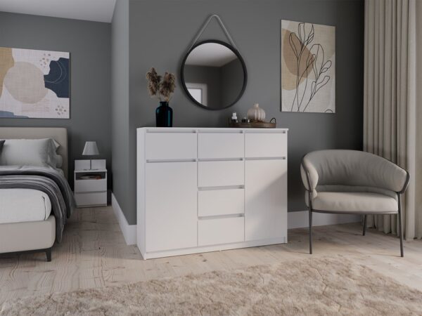 - Uniwersalny design: Prosta, elegancka forma komody w kolorze biel mat sprawia, że będzie pasować zarówno do nowoczesnych, jak i klasycznych aranżacji wnętrz. Bezuchwytowe fronty podkreślają minimalistyczny charakter, jednocześnie zapewniając wygodę użytkowania.