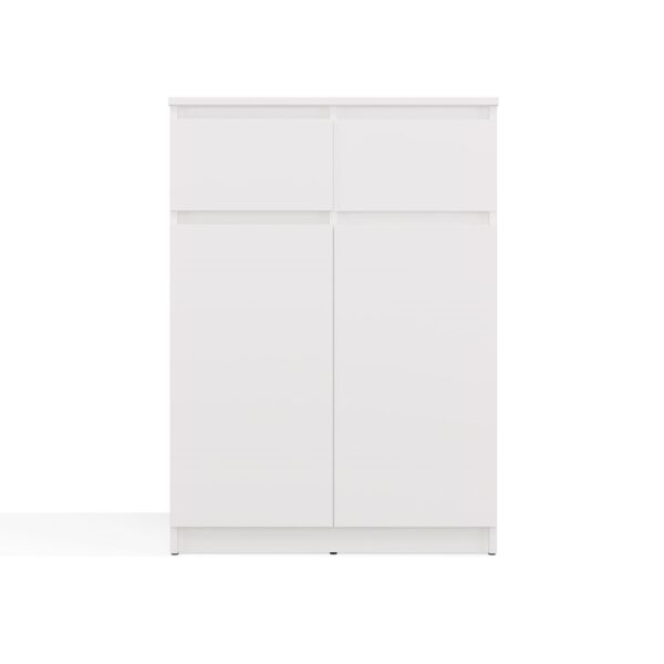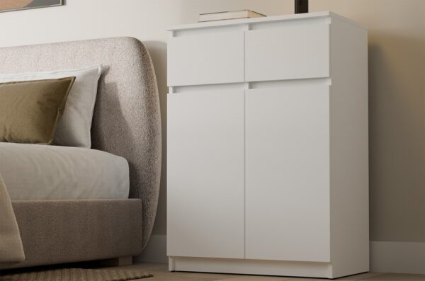 Komoda 2DD2S w kolorze białym to doskonałe połączenie funkcjonalności i nowoczesnej estetyki, idealne do jasnych i przestronnych wnętrz.