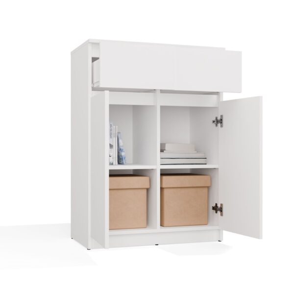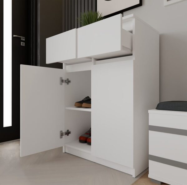 Dzięki dwóm parom drzwi oraz dwóm pojemnym szufladom, komoda zapewnia dużą przestrzeń do przechowywania. Praktyczne półki i głębokie szuflady pomagają w organizacji ubrań, dokumentów i innych przedmiotów codziennego użytku, ułatwiając utrzymanie porządku.
