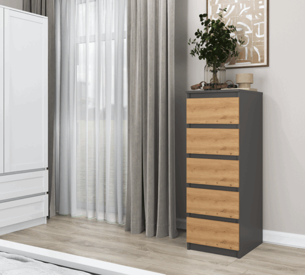 - Wysoka komoda oferuje mnóstwo miejsca do przechowywania, a nie zajmuje dużo miejsca