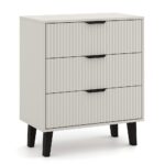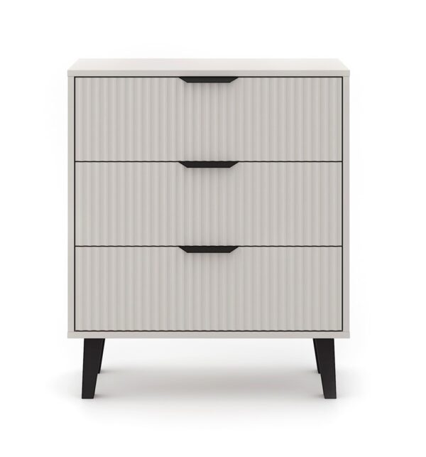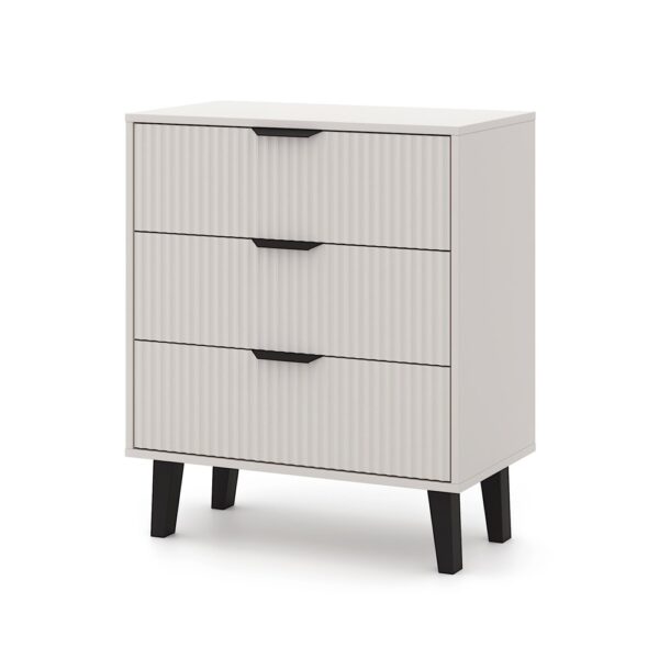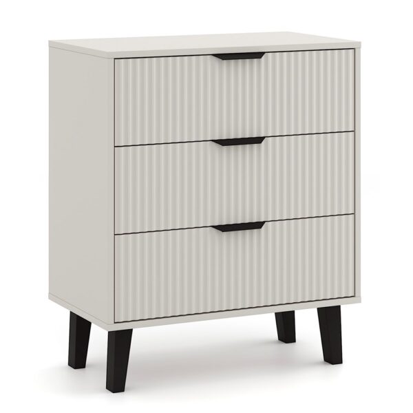 Komoda SCANDI 3S SLIM to idealna propozycja dla tych, którzy szukają praktycznego mebla do przechowywania z nutą nowoczesnego designu. Modny kolor Kaszmir w połączeniu z ryflowanymi frontami i wysokimi czarnymi nóżkami nadaje wnętrzu przytulności, a jednocześnie elegancji.