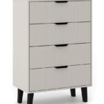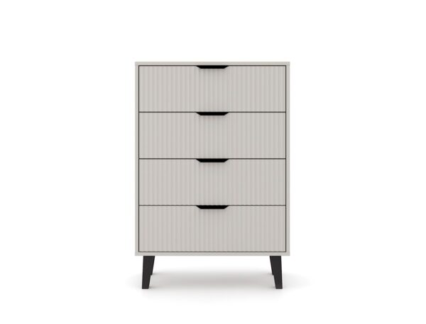 Komoda SCANDI 4S SLIM to idealna propozycja dla tych, którzy szukają praktycznego mebla do przechowywania z nutą nowoczesnego designu. Modny kolor KASZMIR w połączeniu z ryflowanymi frontami i wysokimi czarnymi nóżkami nadaje wnętrzu przytulności, a jednocześnie elegancji.
