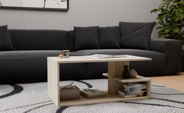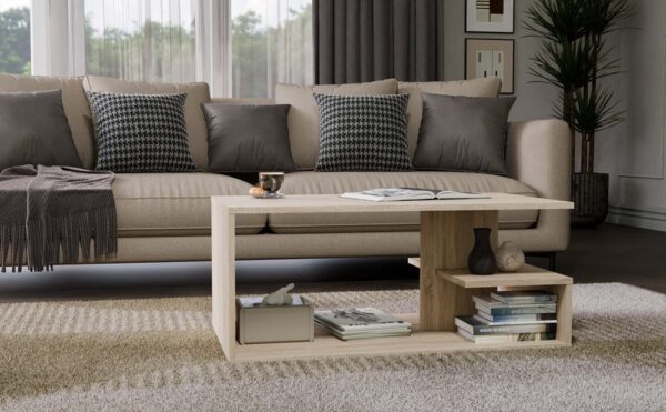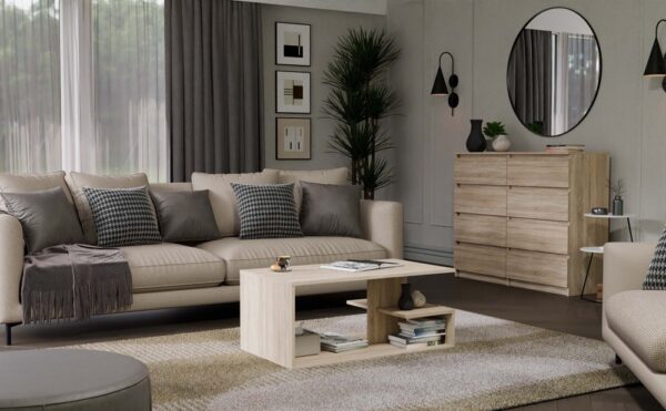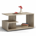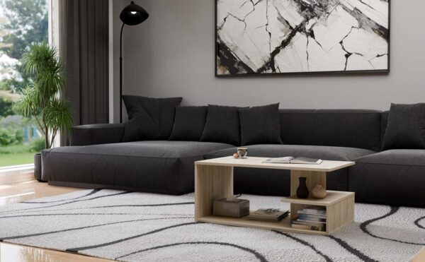 Ława kawowa wykonana z solidnej płyty laminowanej wraz z dodatkową półką na przedmioty codziennego użytku. Świetnie nadaje się do nowoczesnych salonów, mniejszych pokoi, czy eleganckich biur.