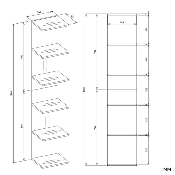Mebel wyposażony jest w 6 otwartych półek, które umożliwiają wygodne przechowywanie książek, dokumentów, dekoracji oraz innych codziennych przedmiotów. Wysoka konstrukcja sprawia, że regał oferuje dużo przestrzeni użytkowej przy zachowaniu kompaktowych wymiarów.