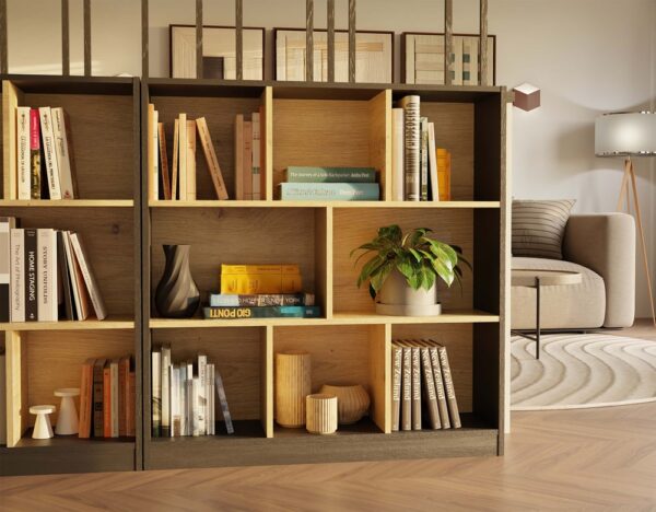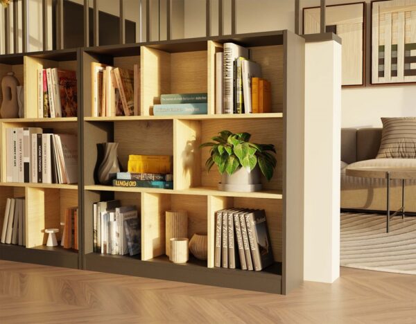 Dzięki 8 pojemnym i proporcjonalnie rozmieszczonym przegrodom, regał FIESTA 8P umożliwia estetyczne przechowywanie książek, dokumentów, ozdób czy pudełek. Dekoracyjne połączenie głębokiego antracytu z ciepłym drewnem dębu artisan dodaje wnętrzu nowoczesnego, a zarazem przytulnego charakteru.