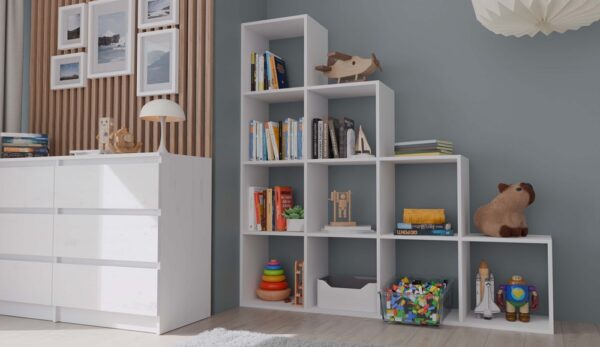 STEP sprawdzi się jako regał pokojowy, może być przegrodą pokoju, ponieważ wygląda jednakowo dobrze z każdej strony.