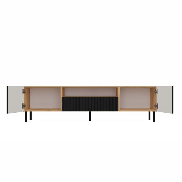 Dużym atutem są okrągłe metalowe nogi o wysokości 13 cm, które nadają wizualnej lekkości całej konstrukcji i sprawiają, że szafka RTV jest stabilna.