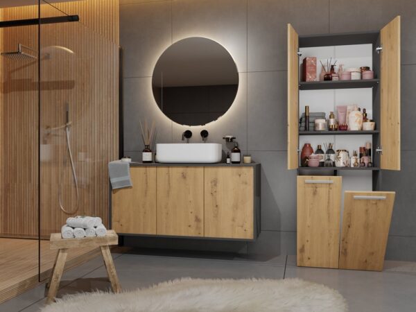 - W ofercie również szafki z otwartymi półkami oraz dwoma koszami