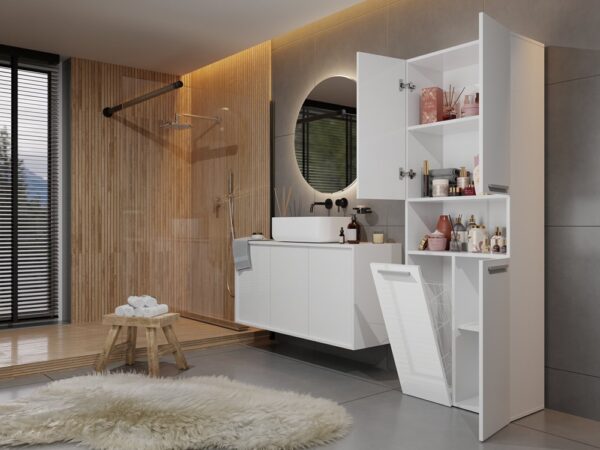 - Szafka posiada 5 praktycznych (4 zamykane, 1 otwarta) półek oraz kosz