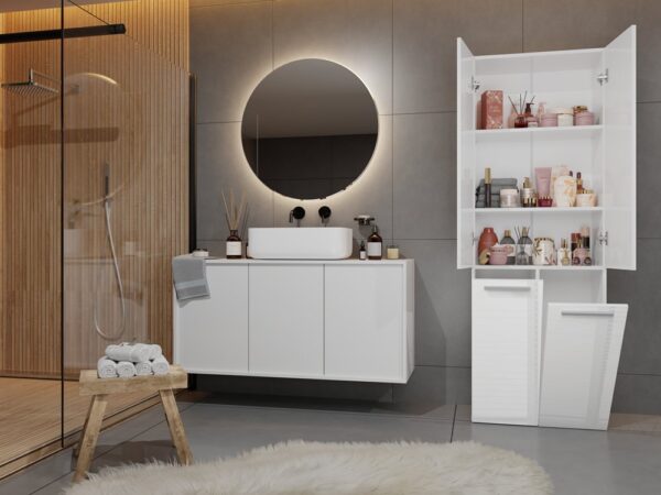- Szafka posiada 3 praktyczne, zamykane półki oraz 2 kosze