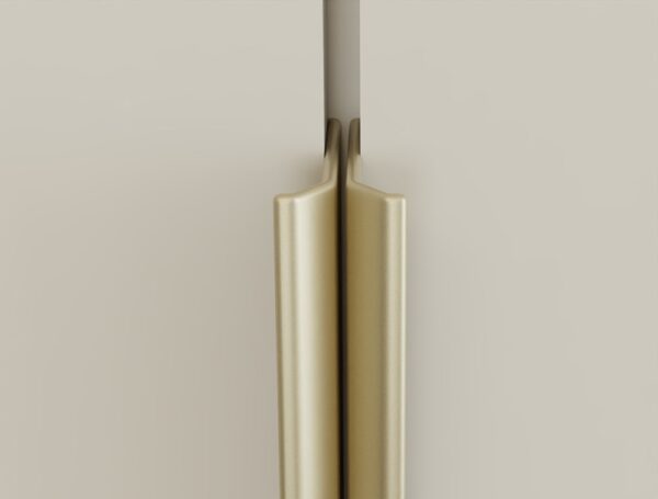 - Minimalistyczny front + dekoracyjne uchwyty w kolorze szczotkowanego złota – elegancja bez przesady.