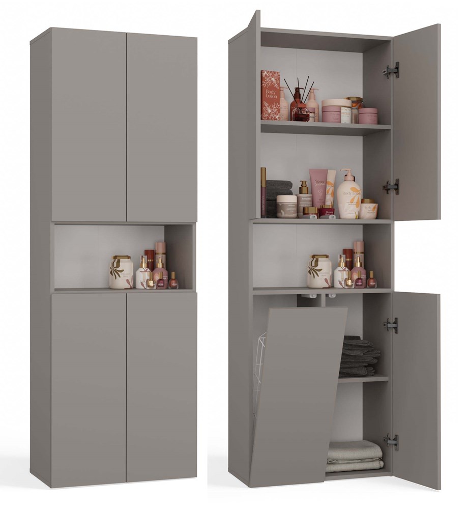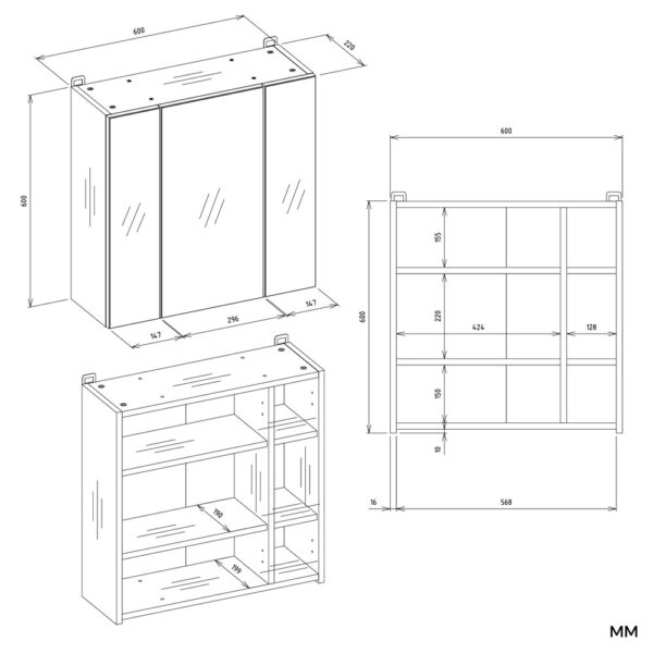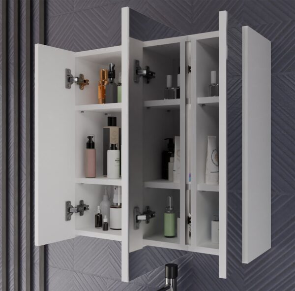 - Wyposażona w 6 praktycznych półek schowanych za stylowymi drzwiczkami z lustrzanym frontem.