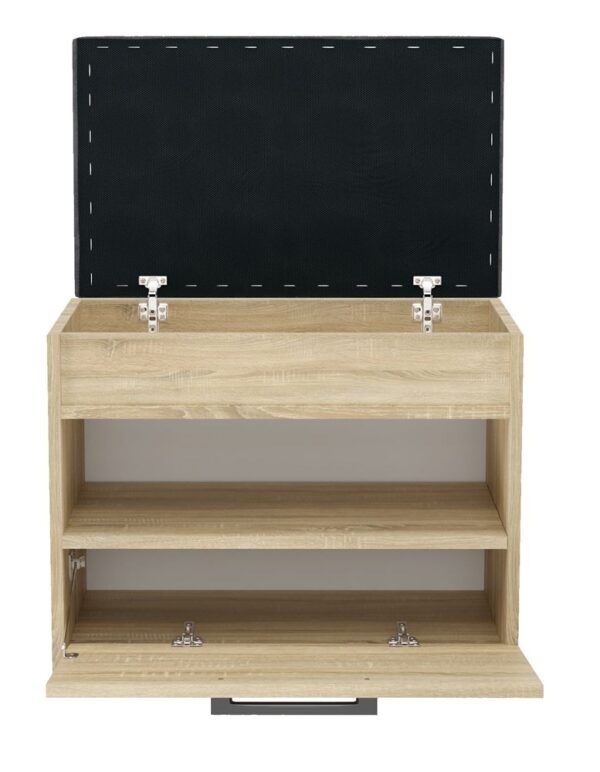 Komfortowa szafka na obuwie z tapicerowanym siedziskiem oraz schowkiem na gadżety. Szafka posiada uchylne drzwi za którymi znajduje się półka.