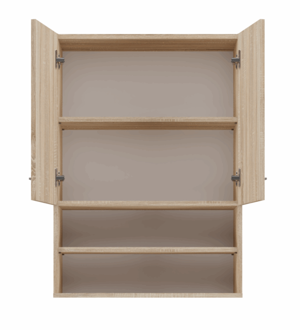 - Szafka posiada 2 półki otwarte oraz 2 schowane za drzwiami