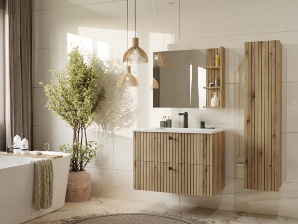 Szafka łazienkowa TIGO 80 2S to propozycja dla osób, które poszukują równowagi pomiędzy eleganckim designem a praktyczną organizacją w łazience. Fronty szuflad wykonane z ryflowanego MDF-u w stylu lameli nadają meblowi charakterystyczny, dekoracyjny wygląd, który idealnie wpisuje się w aktualne trendy wnętrzarskie.