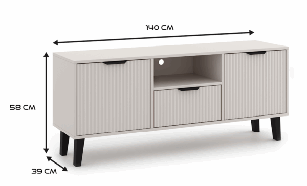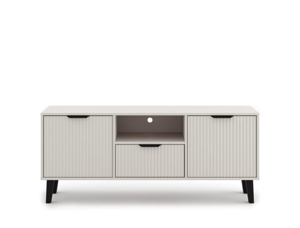 Szafka RTV SCANDI 2D1S SLIM to połączenie funkcjonalności i estetyki, idealne dla miłośników prostych, a jednocześnie stylowych wnętrz. Ryflowane fronty oraz smukła forma osadzona na wysokich czarnych nóżkach nadają meblowi lekkości i wyrazistego charakteru.