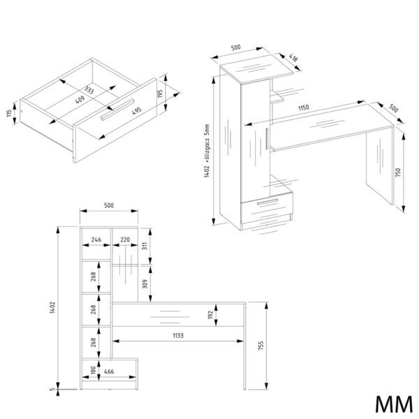 Konstrukcja: Biurko z wysokim regałem i szufladą
