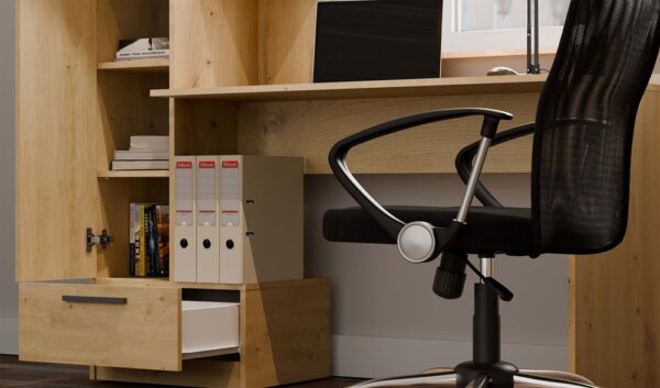 Zintegrowany regał wyposażono w część zamykaną drzwiami, za którymi znajdują się trzy pojemne półki, a także w szufladę oraz półki otwarte, dzięki czemu z łatwością posegregujesz wszystkie potrzebne rzeczy – od książek i dokumentów po drobiazgi.